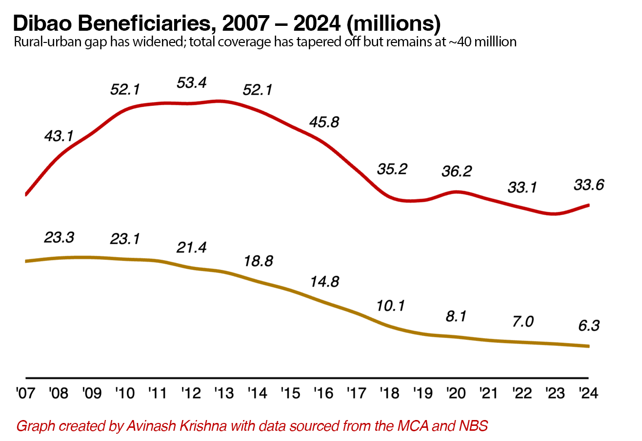 Formal Party status is a second way: Communist Party members earn roughly 10-25% more than comparable non-members, with the advantage of course largest at the top of the distribution6. These badges are rationed and young people increasingly treat admission as their main route to stable livelihoods. And even at the bottom, local village and township cadres decide who actually receives dibao and related assistance: “eligibility” is almost exclusively filtered through political and moral criteria since there isn’t enough money to go around.